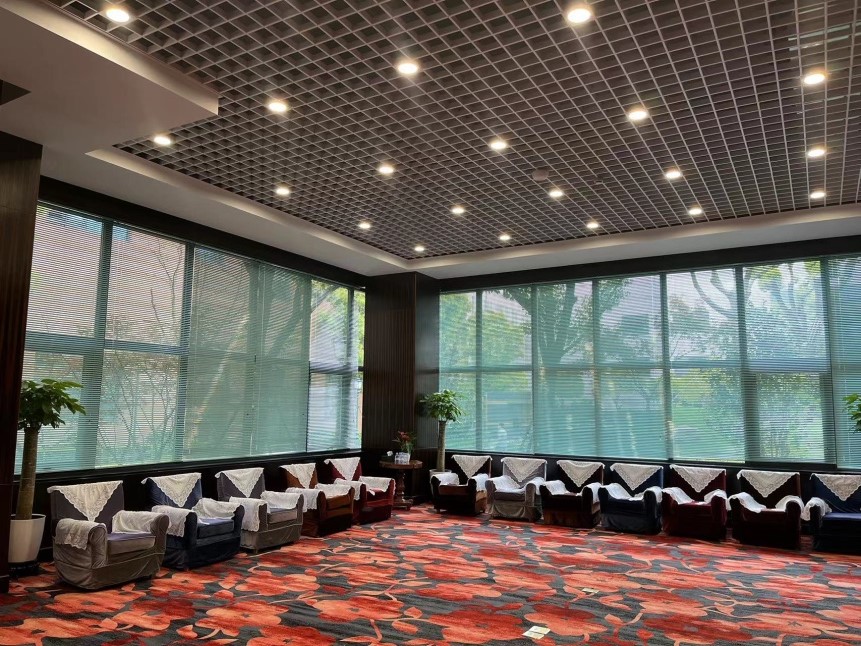 大(dà)樓延續了原紀展路辦(bàn)公區沉穩(wěn)大氣的裝修風格,兩層挑空的前廳寬敞氣派,高大的(de)水晶吊燈流光溢彩,巨幅壁畫奠定了整體的藝術基調。
