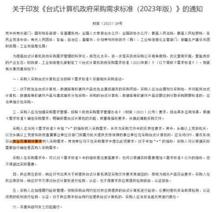 近日,中國財政部與工信部(bù)聯合發布新指導(dǎo)方針,對(duì)政府采購個人電腦和服(fú)務器的技術標(biāo)準進行(háng)了更新。新方針強調采購設備需符合“安全可靠(kào)”的處理器和操作係統要求,旨在推動本土技術解決方案的發展。